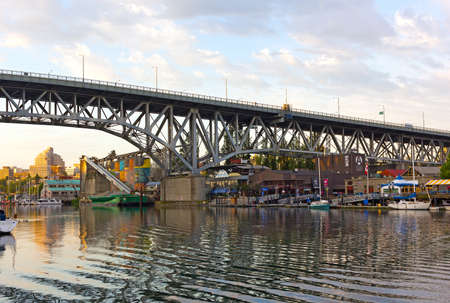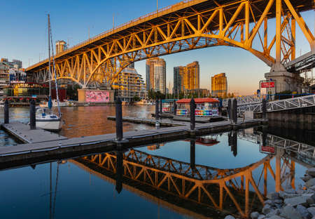 VANCOUVER, CANADA – JUNE 26: Granville island with a famous public market and old industrial part along False Creek on June 26, 2017 in Vancouver. Sunset over Granville Island with a view on the bridge and moored boats.