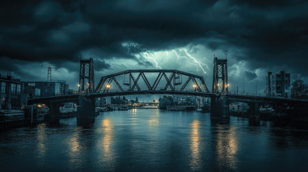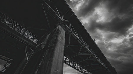 This striking image captures a low-angle view of a bridge under a stormy sky, emphasizing its architectural lines and textures. The dramatic contrast enhances its urban appeal.