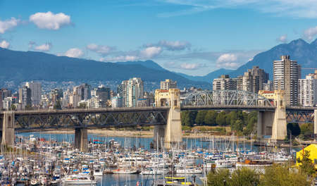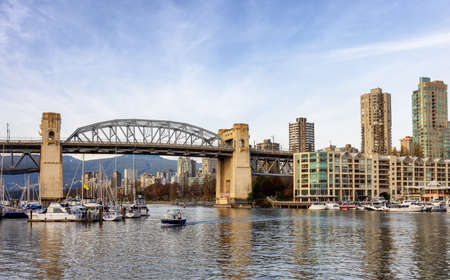 Downtown Vancouver, British Columbia, Canada - August 28, 2021: View of Burrard Bridge and False Creek in a Modern City on the West Coast of Pacific Ocean.