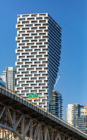 Vancouver House skyscraper center, modern architecture in Downtown Vancouver BC. Twisted tower by BIG. Street photo, travel photo, no people, concept photo modern architecture. July 29,2021
