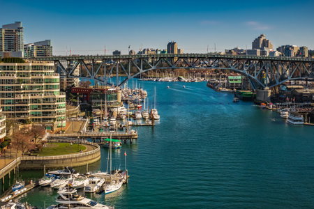 Panoramic aerial view of False creek in Vancouver in a sunny day, Canada. Boats and yachts at the Fisherman Wharf piers in False Creek marina close to Granville Island. Travel photo-March 22,2023