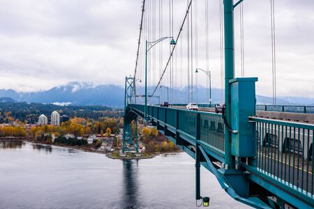 VANCOUVER, CANADA - OCTOBER 30, 2018: The Lions Gate Bridge, which connects Vancouver to the North Shore across Burrard Inlet, allows for vehicle, bicycle, and pedestrian traffic.