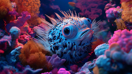 A stunning underwater photograph showcasing a pufferfish swimming gracefully among vibrant coral reefs, highlighting the beauty of marine life and ecosystems.