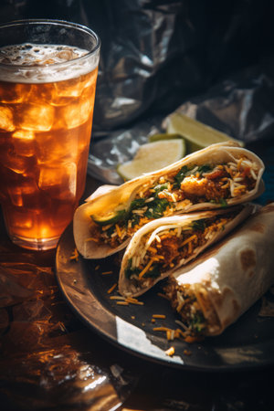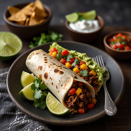 Delicious mexican cuisine featuring burrito and nachos with fresh vegetables.