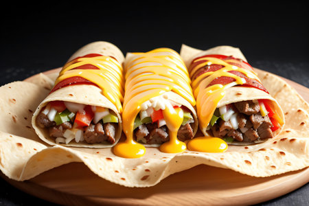 beef burritos and cheese-stuffed rice wraps with cheese and cilantro are beautifully presented on a rustic wooden table. this high-quality image, captured in the style of hasselblad h6d-400c, showcases the piles and stacks of these delicious wraps. the vibrant colors of dark orange and white create a bold and eye-catching display. ai generated
