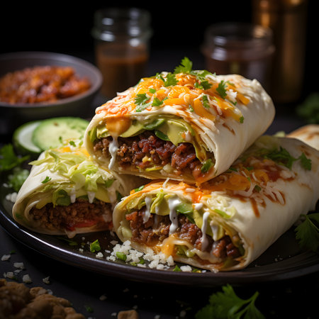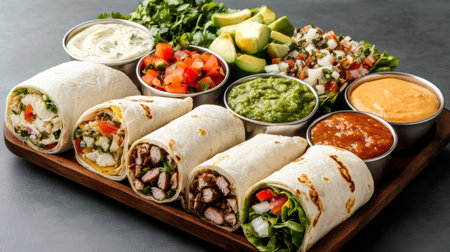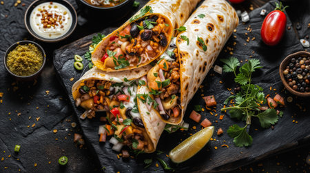 Appetizing burritos with colorful fillings including beans, cheese, vegetables, and herbs served with various dips on a dark stone surface surrounded by fresh ingredients and garnishes