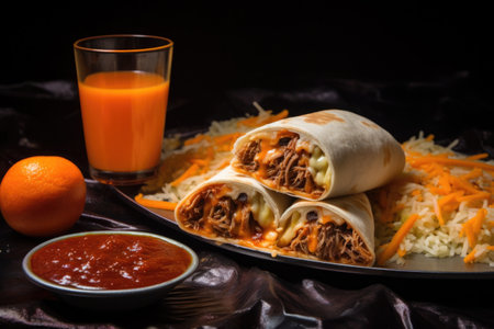 shredded cheese and hot sauce beside burrito, created with generative ai