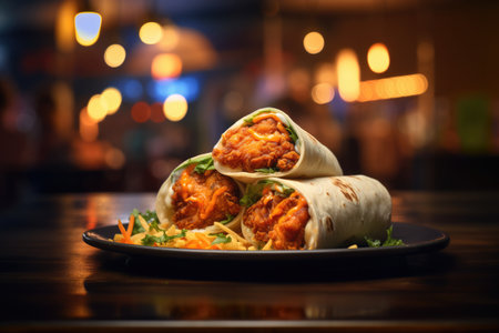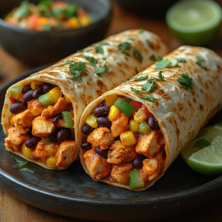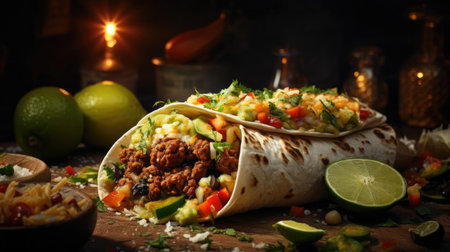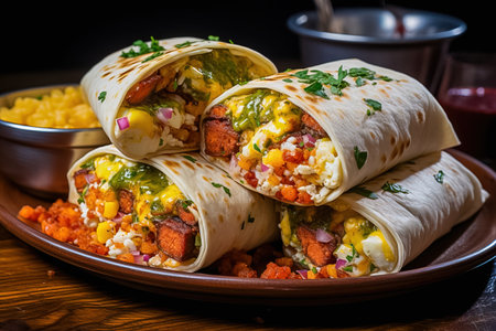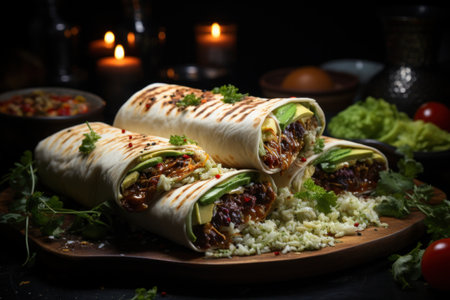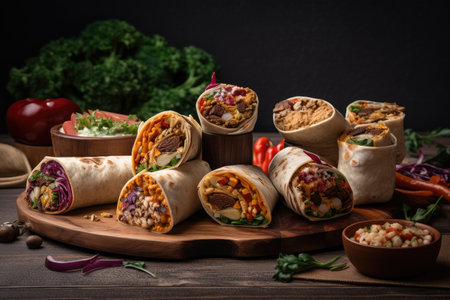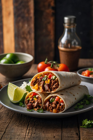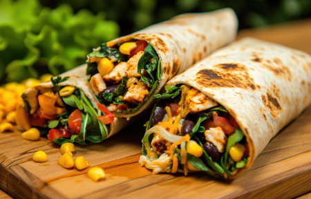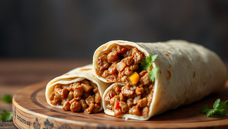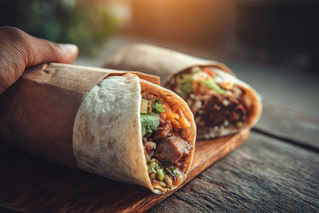 Delicious vegetarian burritos filled with fresh ingredients on a wooden table during a cozy meal preparation