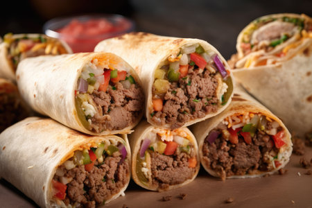 full of burritos with vegetables and meat on a wooden table with blurred background