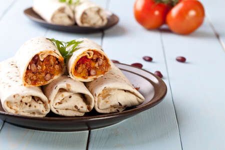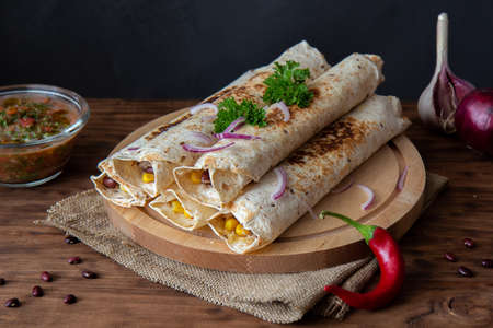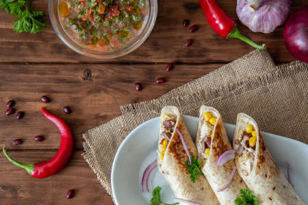 Traditional Mexican food burritos with beans and vegetables. Vegetarian rolls with red beans and vegetables lie on an aged wooden table.