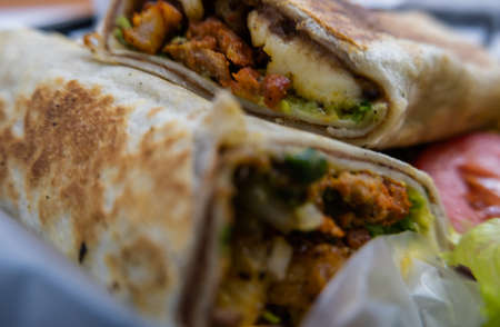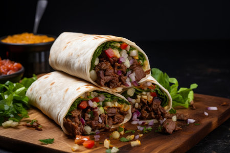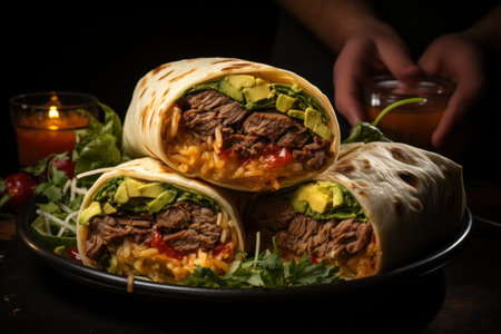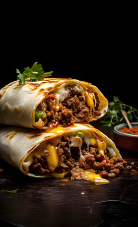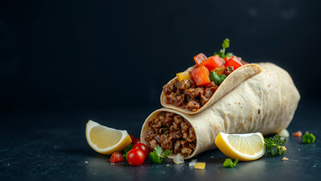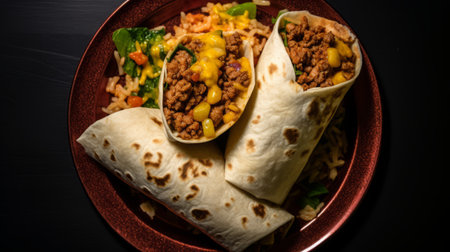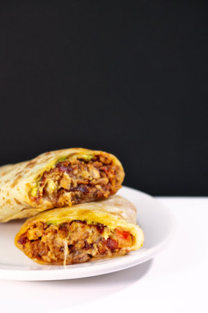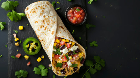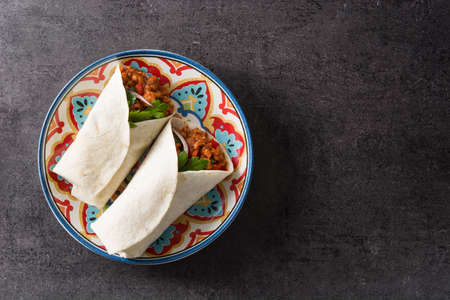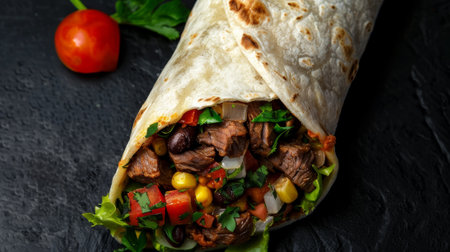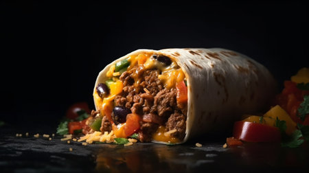 Typical Mexican burrito wrap with beef, beans and vegetables on black background. Top view. Copyspace