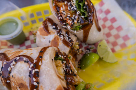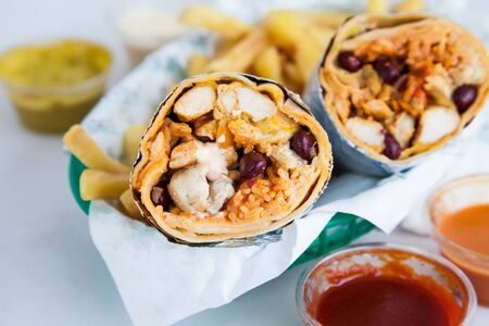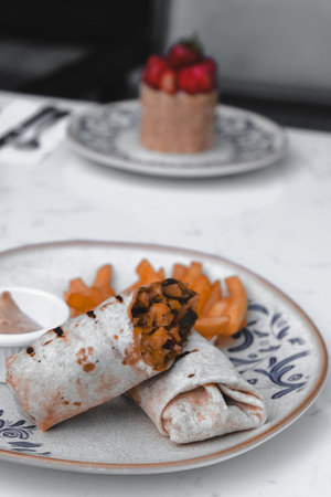 Traditional Mexican food, Beef burritos with meat and beans with vegetable