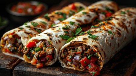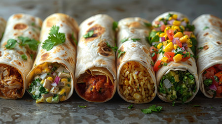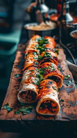 Row of freshly made Mexican burritos with vibrant vegetables and herbs, served on a rustic wooden board in an artisan kitchen.