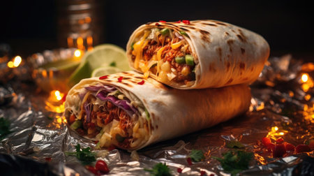 wrapped sandwiches, rolled in the style of aerial photography, showcase the traditional mexican style. captured in stunning 8k resolution, the photo highlights subtle lighting contrasts that enhance the visual appeal. the varying wood grains add a textural element, while the sandwiches themselves come in multiple styles. ai generated