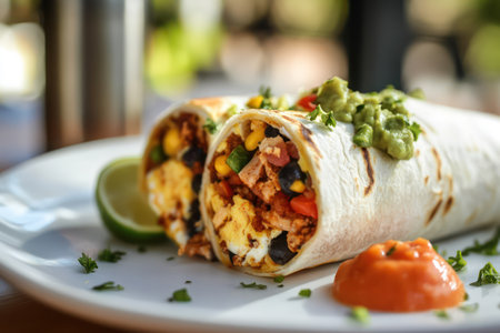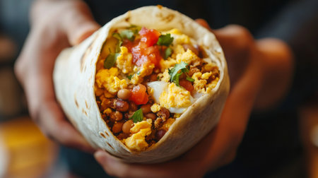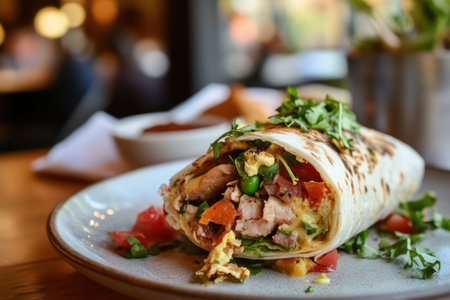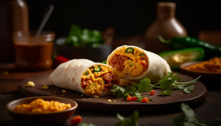 Delicious breakfast burrito served on a modern brunch table, representing casual dining, comfort food, and contemporary culinary culture.
