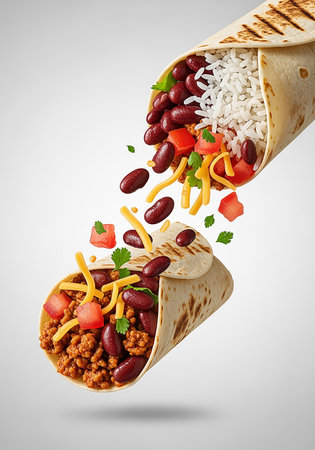 Conceptual image of mexican burrito with beans and vegetables flying in air