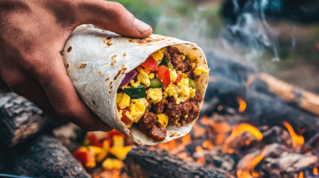 AI Generated. A breakfast burrito filled with buckwheat scrambled eggs black beans and salsa for a proteinpacked start to your day