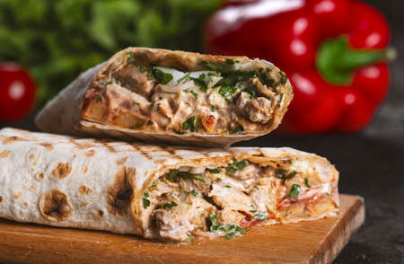 shawarma sandwich fresh roll, wrap of grilled meat and salad tortilla wrap with white sauce. Turkish Doner Kebab on a lavash served on wooden board