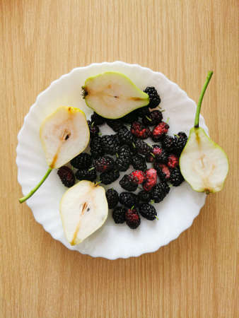 Close-up of raspberry and black mulberry berries split frame. Summer vitamins, sweet berries