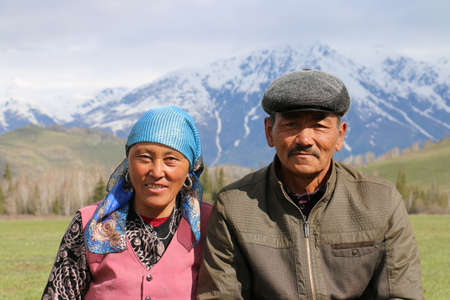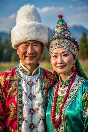 Portrait of a Kyrgyz woman showcasing traditional clothing and accessories, with a blurred mountain landscape in the background