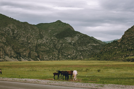 Group of horses with foal standing on pasture against rocky mountain slopes in Altai region. Peaceful countryside view with natural grassland and cloudy weather