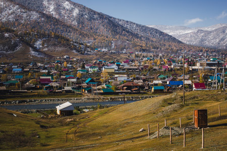 A residential village in the mountains of the Altai Republic during autumn, with frost covering the roofs and landscape, adding a crisp stillness to the colorful scenery.
