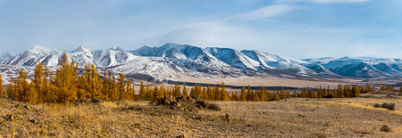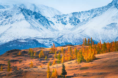 Snow-covered mountains with yellow autumn trees. Beautiful autumn landscape. Kurai steppe in Altai mountains, Siberia, Russia.