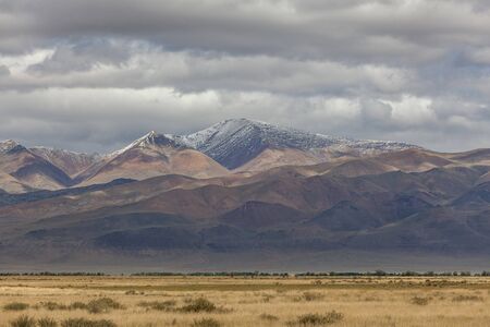 Soft focus. Withered grass field, snow covered mountains, cloudy sky. Mongolian landscapes and landmarks. Yellow steppe and dark mountains at sunset. Blue sky with clouds.