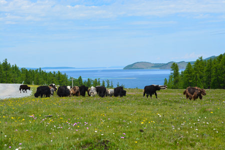 Lake Baikal, hills and cows eat grass with beautiful sky and clouds, Russia Oklhon island