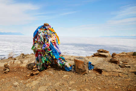A pillar with multicolored ribbons for making wishes, offerings for spirits on a stone. A popular tourist destination in the north of Olkhon Island near Cape Khoboy. Lake Baikal in spring.