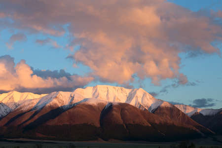 Strong sunset light that shines in the evening on the Aktru mountain that are covered with snow. Altai region, west Siberia, Russia