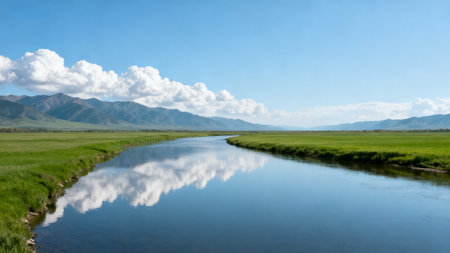 Mongolian landscape with river and grassland under blue sky
