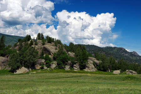 Beautiful landscape with a mountain range on a blue sky with white clouds on the forest meadows and lake in summer Russia, Chelyabinsk region, Zyuratkul Range