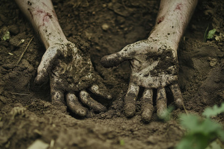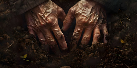 A close-up view of a farmer's hands deeply engaged in cultivating soil, showcasing the textured and earthy tones of the dirt, emphasizing hard work and connection to nature.