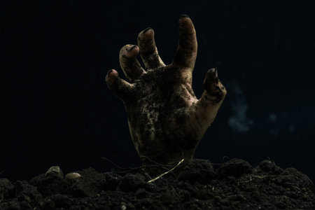 Creepy zombie hand covered in dirt reaches out from a grave in a dark, foggy cemetery, creating a chilling scene.