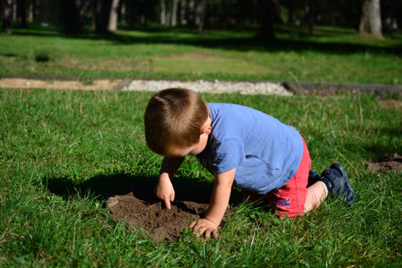 Toddler boy playing and digging soil on the ground in park in sunny summer day. Kid having fun outside.
