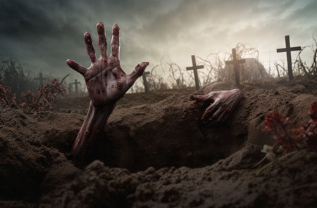 Zombie hand cemetery fear. Scary dead. Generate AI