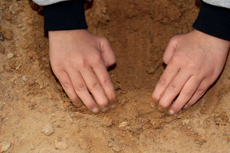 Dig a hole with your hands. A child is playing in the sandbox. Hands in the sand. Spring games.