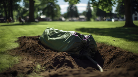 Burying grave. Funeral details. Mourning ceremony. Gravedigger with shovel. Burial of body.