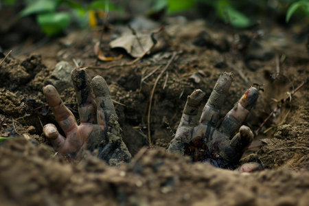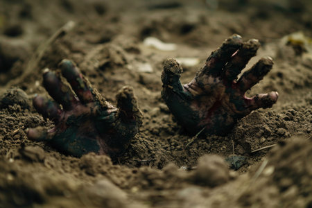 Two hands covered in dirt and debris emerge from the ground in a dense forest, suggesting an eerie and mysterious situation during the twilight hours.