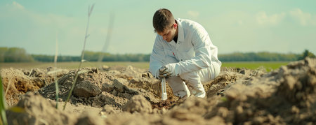 A hand in a latex glove lifting polluted soil filled with microplastics and debris. Minimal pollution and environmental protection concept. Copy space.