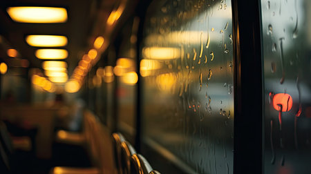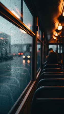 A serene and cozy bus interior on a rainy day with warm lighting illuminating empty seats, inviting relaxation and comfort during a city commute or journey.