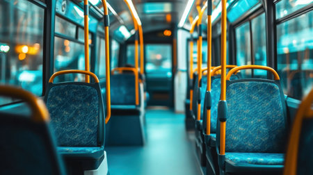 Sleek bus interior with empty seats, reflecting a modern, comfortable design ideal for urban public transportation and commuting.