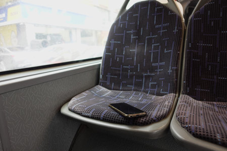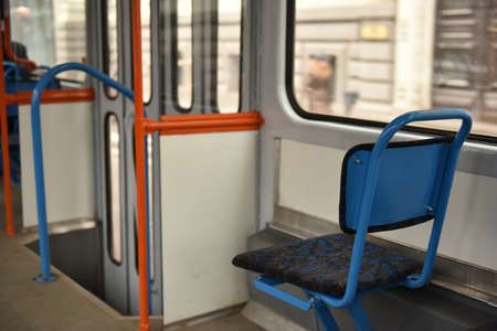 Interior of an empty metro carriage in Brussels, Belgium, selective focus.