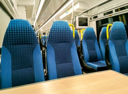 Inside The Wagon Train Germany, Dusseldorf. Empty train interior. interior view of corridor inside passenger trains with blue fabric seats of German railway train system.