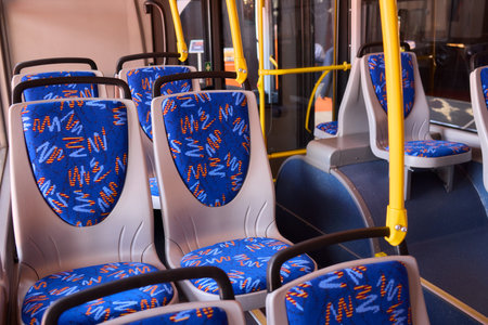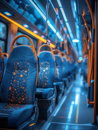 Sleek bus interior with empty seats, reflecting a modern, comfortable design ideal for urban public transportation and commuting.