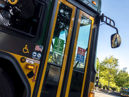 Kirkland, WA / USA - circa May 2020: Street view of a 'Fare Payments Temporarily Suspended' sign on a King County Metro bus during the COVID-19 outbreak.