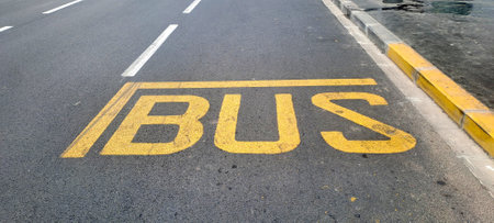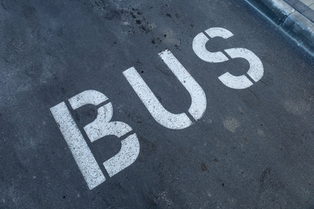 The gray pavement features bold white lettering indicating a designated bus parking area, highlighting urban transit organization.