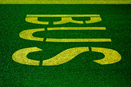 Yellow bus stop marking painted on asphalt road surface indicating designated area for buses to stop