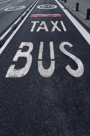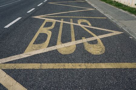 Bus lane in the city of Madrid, Spain. The bus lane sign painted on the asphalt on a sunny day.